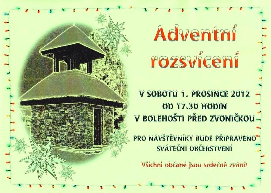 Adventní rozsvícení 2012Pozvánka na ADVENTNÍ ROZSVÍCENÍ, které se bude konat před zvoničkou v sobotu 1. prosince v 17:30 hodin.