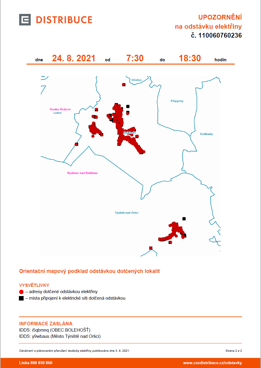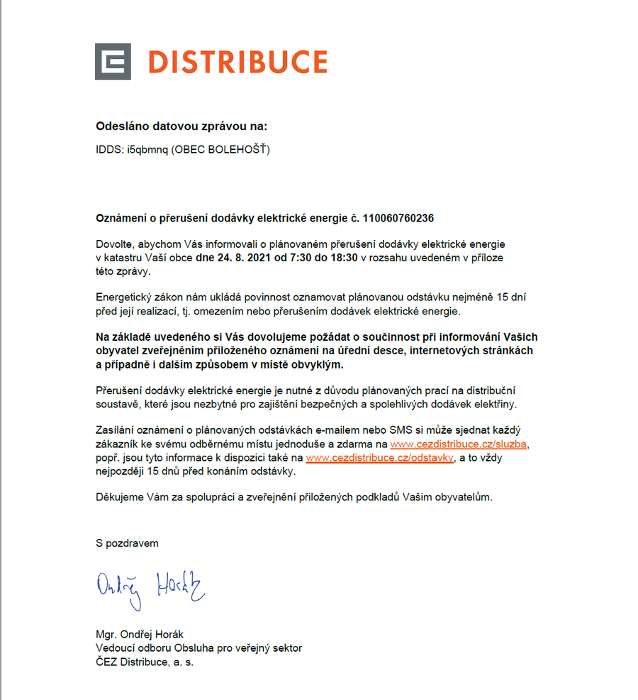 Úvod > Obec > Aktuálně z obce > Oznámení o přerušení dodávky elektrické energie dne 24. 8. 2021 - celá obec