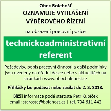 Úvod > Obec > Aktuálně z obce > VEŘEJNÁ VÝZVA na obsazení pracovní pozice - technickoadministrativní referent