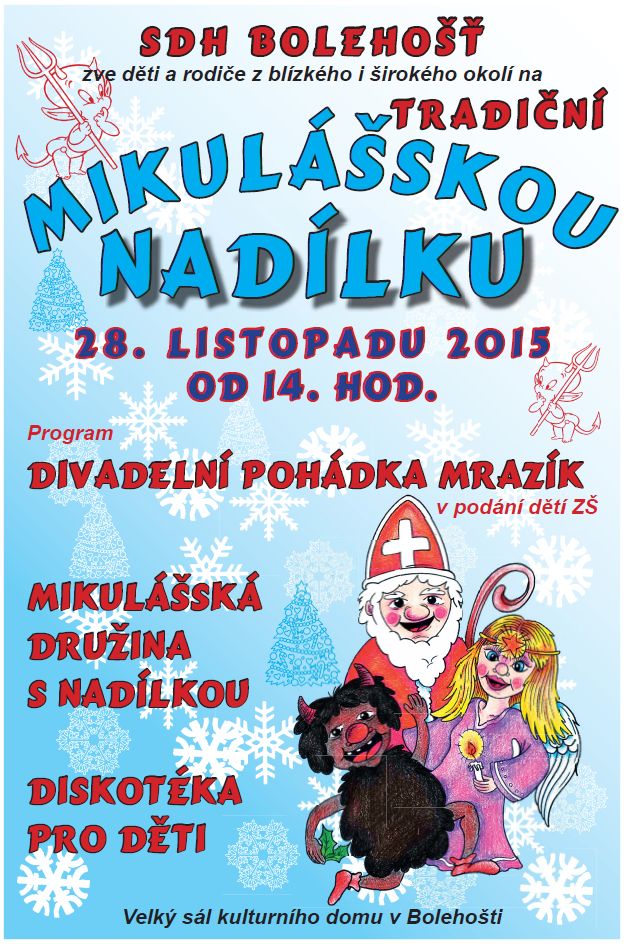 28. listopadu jsme uspořádali již tradiční Mikulášskou nadílku, které se zúčastnily děti z širokého okolí. Tato nadílka byla obohacena divadelním představením Základní školy v Bolehošti, jejíž žáci si pod vedením paní Mgr. Hany Boukalové a paní Mgr. Denisy Školníkové připravili inscenaci divadelní hry Mrazík. Rádi bychom touto cestou poděkovali za nádherné představení.