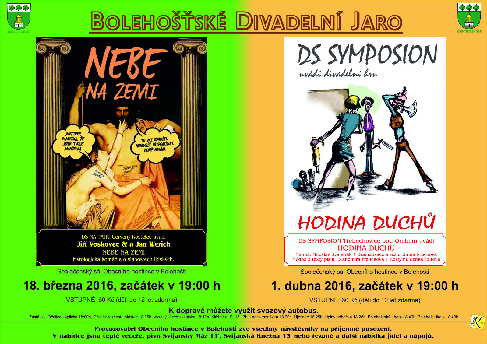 Mytologická komedie dvojice V + W „Nebe na zemi“ o slabostech lidských přilákala do Obecního hostince přes šedesát návštěvníků z Bolehoště i okolních obcí, kteří odcházeli domů s úsměvem a pěkným kulturním zážitkem. Opět bylo možné zdarma využít svozový autobus.