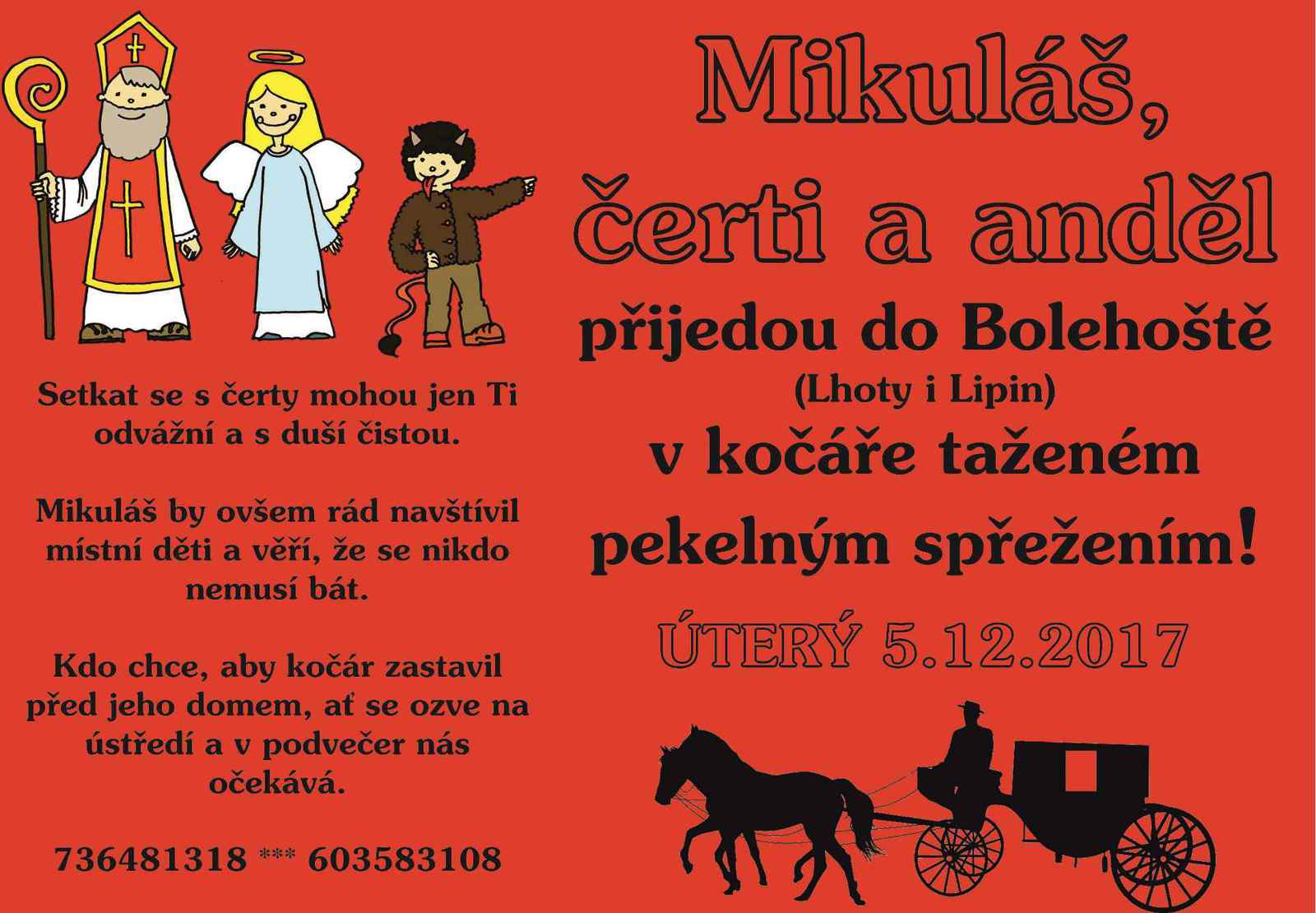 Kůň černý jako noc, kočár rovnou z pekla, na něm dva rohatí, kteří k sobě po cestě přibrali i dva svaté. Ti dohlíželi, aby čerti nevzali ty nepravé. Jestli tento rok naplnili pytel zlobivými dětmi to nevím, ale dobrot měli plný koš. Kdo byl hodný, nemusel se bát, no a ten, kdo zlobil, už teď ví, jak vypadá peklo …