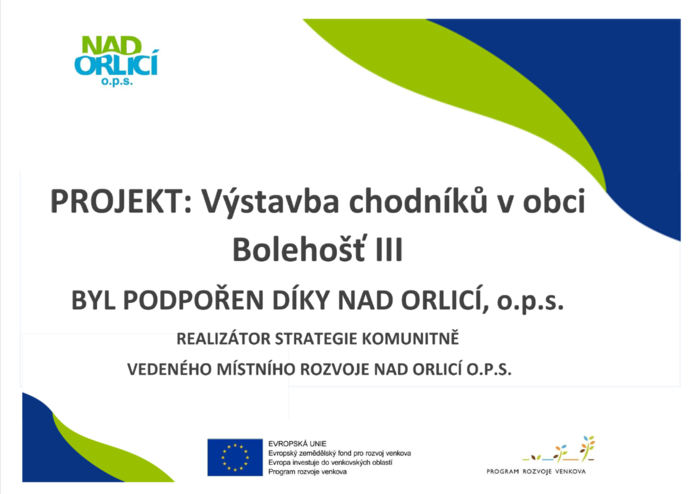 Cílem projektu je zvýšení bezpečnosti provozu chodců v obci Bolehošť prostřednictvím realizace rekonstrukce a vybudování nové části chodníku v obci.